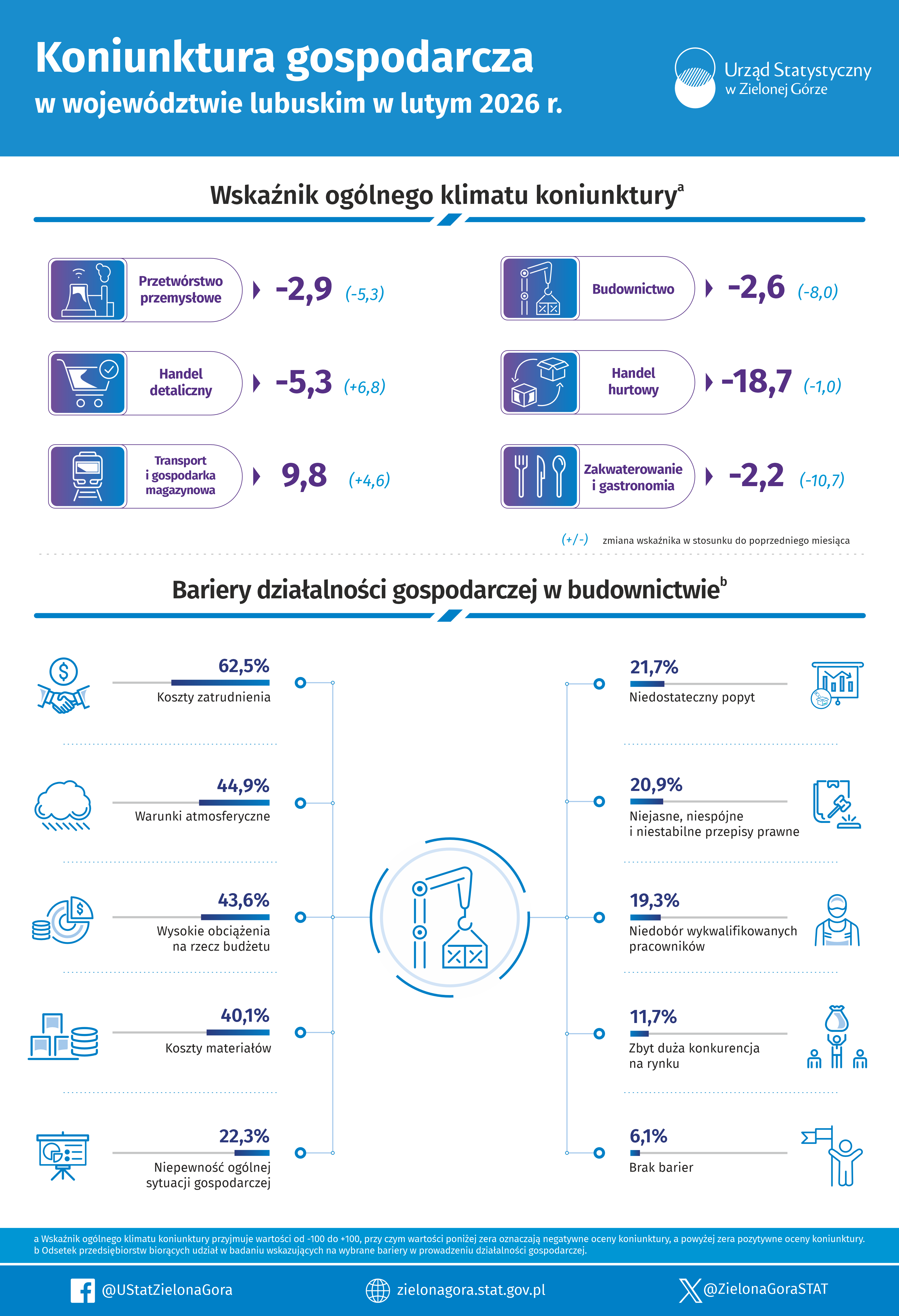 Koniunktura gospodarcza w województwie lubuskim w lutym 2026 r. - INFOGRAFIKA A A A 27.02.2026 Pliki do pobrania Opis alternatywny - Koniunktura gospodarcza w województwie lubuskim w lutym 2026 r. - INFOGRAFIKA 0.04 MB Koniunktura gospodarcza w województwie lubuskim w lutym 2026 r. - INFOGRAFIKA 1.65 MB Koniunktura gospodarcza w województwie lubuskim w lutym 2026 r. - INFOGRAFIKA 0.01 MB Archiwum 2025 Koniunktura gospodarcza w województwie lubuskim w styczniu 2026 r. - INFOGRAFIKA Koniunktura gospodarcza w województwie lubuskim w grudniu 2025 r. - INFOGRAFIKA Koniunktura gospodarcza w województwie lubuskim w listopadzie 2025 r. - INFOGRAFIKA Koniunktura gospodarcza w województwie lubuskim w październiku 2025 r. - INFOGRAFIKA Koniunktura gospodarcza w województwie lubuskim we wrześniu 2025 r. - INFOGRAFIKA Koniunktura gospodarcza w województwie lubuskim w sierpniu 2025 r. - INFOGRAFIKA Koniunktura gospodarcza w województwie lubuskim w lipcu 2025 r. - INFOGRAFIKA Koniunktura gospodarcza w województwie lubuskim w czerwcu 2025 r. - INFOGRAFIKA Koniunktura gospodarcza w województwie lubuskim w maju 2025 r. - INFOGRAFIKA Koniunktura gospodarcza w województwie lubuskim w kwietniu 2025 r. - INFOGRAFIKA Koniunktura gospodarcza w województwie lubuskim w marcu 2025 r. - INFOGRAFIKA Koniunktura gospodarcza w województwie lubuskim w lutym 2025 r. - INFOGRAFIKA