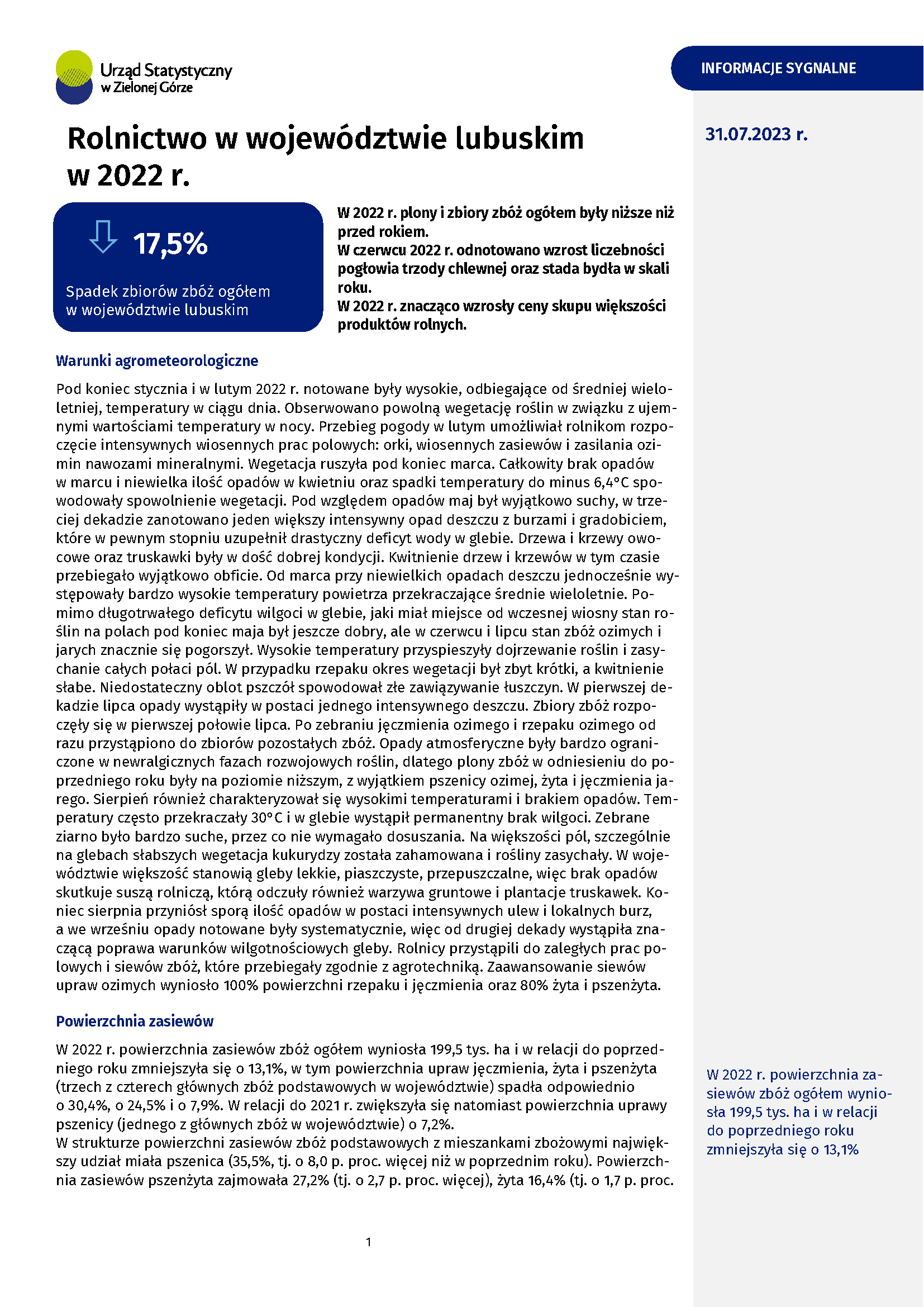 Rolnictwo w województwie lubuskim w 2022 r. A A A 31.07.2023 Pliki do pobrania Rolnictwo w województwie lubuskim w 2022 r. 0.89 MB Rolnictwo w województwie lubuskim w 2022 r. - dane do wykresów 0.03 MB Wyjdź z archiwum 2023 Rolnictwo w województwie lubuskim w 2024 r. Rolnictwo w województwie lubuskim w 2023 r. 2022 Rolnictwo w województwie lubuskim w 2022 r. 2021 Rolnictwo w województwie lubuskim w 2021 r. 2019 Rolnictwo w województwie lubuskim w 2019 r. 2018 Rolnictwo w województwie lubuskim w 2018 r. 2017 Rolnictwo w województwie lubuskim w 2017 r. 2016 Rolnictwo w województwie lubuskim w 2016 r.